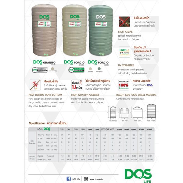 ด้วยวัสดุ Polymer Elixer ทำให้ถังเก็บน้ำ DOS แข็งแรง ทนทาน ไร้สารพิษ ป้องกันแสงแดด ไร้กลิ่น และปลอดภัย